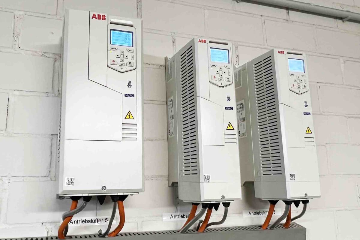 Im Prüffeld des ABB-Standortes Ratingen regeln ACH580-Frequenzumrichter bedarfsgerecht und energieeffizient die Lüfter der Antriebsmaschine für den Kurzschlussgenerator mit einer Bemessungsleistung von 80 MVA. Sie ersetzen eine Stern-Dreieck-Schaltung, durch die die Lüfter immer auf Volllast liefen.