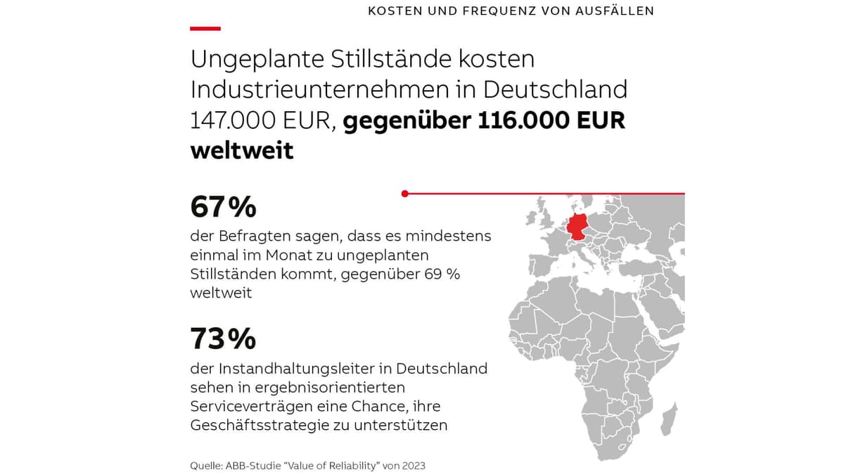 Laut der Studie „Value of Reliability ” kommt es bei 67 Prozent der Industriebetriebe in Deutschland mindestens einmal im Monat zu ungeplanten Stillständen, gegenüber 69 Prozent weltweit. Der deutschen Wirtschaft* entstehen dadurch Kosten in Höhe von 147.000 EUR pro Stunde** (weltweit 116.000 EUR). Trotzdem setzen 21 Prozent der befragten deutschen Unternehmen immer noch auf reaktive Instandhaltungskonzepte.