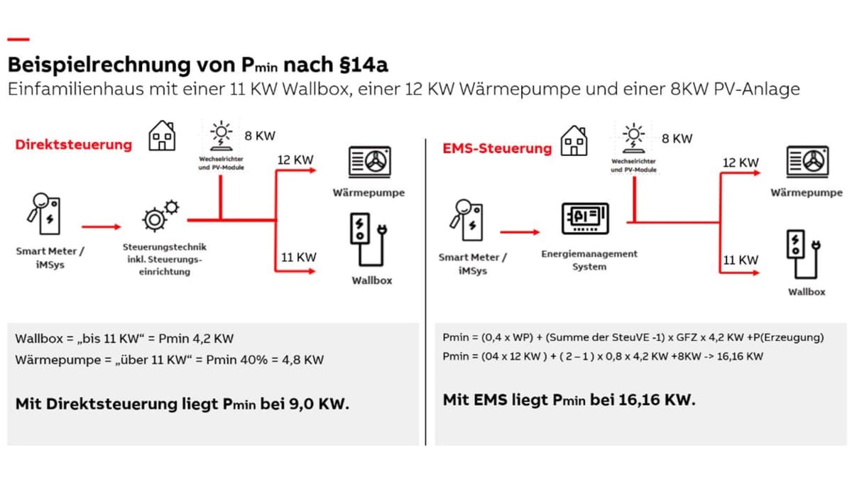 Soll mehr als eine SteuVE angeschlossen werden, sollten Installateure ihre Kunden unbedingt auf die unterschiedlichen Auswirkungen hinweisen, die eine Direktsteuerung und ein Energiemanagement-System (EMS) auf die Mindestleistung (Pmin) haben. So „erlaubt“ die Direktsteuerung im Fall des Dimmens jeder SteuVE eine maximale Leistung von 4,2 kW (bei Wärmepumpen über 11 kW greift eine alternative Berechnung). Wird hingegen ein EMS verbaut, kann der Anwender selbst entscheiden, wie die gedrosselte Leistung auf seine SteuVE aufgeteilt werden soll. Das ist vor allem dann von Vorteil, wenn beispielsweise durch eine PV-Anlage auch eigener Strom erzeugt wird. Wie die Abbildung 1 zeigt, resultieren gemäß der Berechnungsformel (Anlage 1, Punkt 4.5.2 zum Beschluss BK6-22-300) unterschiedlich hohe Pmin. Während bei der Direktsteuerung der Beitrag der PV-Anlage einfach verpufft, kann dieser mit EMS-Steuerung in vollem Umfang genutzt und frei gewichtet werden. Nicht von ungefähr empfiehlt der Zentralverband der Deutschen Elektro- und Informationstechnischen Handwerke (ZVEH) daher den Einsatz eines EMS, wenn mehr als zwei Geräte gesteuert werden müssen oder eine PV-Anlage vorhanden ist.