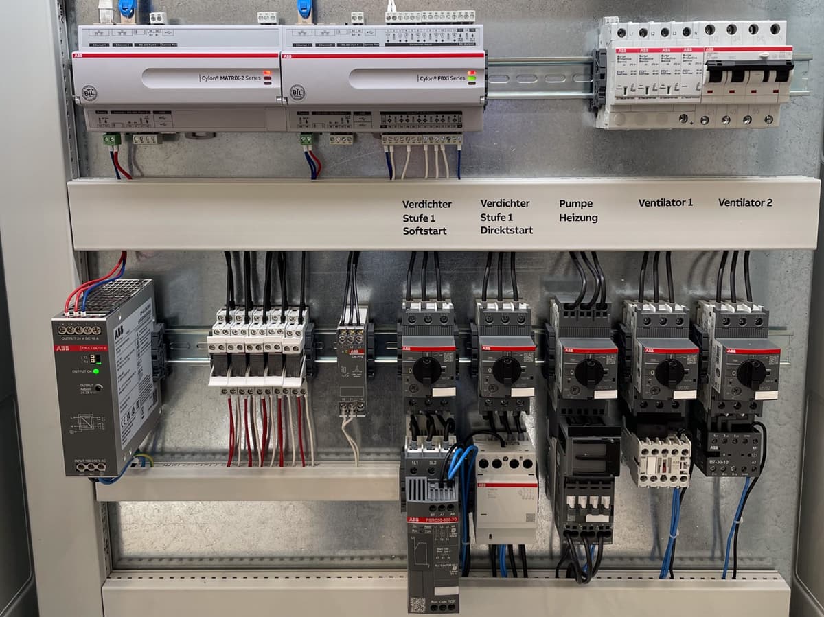 Exemplarischer Aufbau der Steuergeräte für den sicheren und effizienten Betrieb einer Wärmepumpe in Objekten: Die Controller der ABB Cylon®-Serie ermöglichen eine präzise Regelung und Einbindung der HLK-Technik in in mittlere bis große Gebäude, einschließlich Campus-Umgebungen. Der Motorschutzschalter MS132 sorgt in Kombination mit dem PSRC Softstarter für thermischen und elektromagnetischen Schutz.