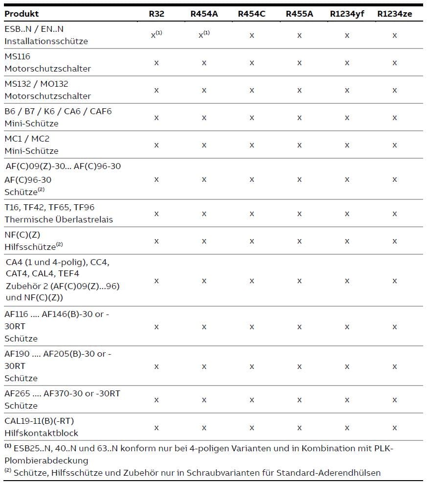In die A2L-Kategorie fallen die Kühlmittel R32, R454A, R454C, R455A, R1234yf, R1234ze. Die in der Abbildung gelisteten Motorschutz- und -steuergeräte von ABB erfüllen diese strengen Vorgaben vollumfänglich.